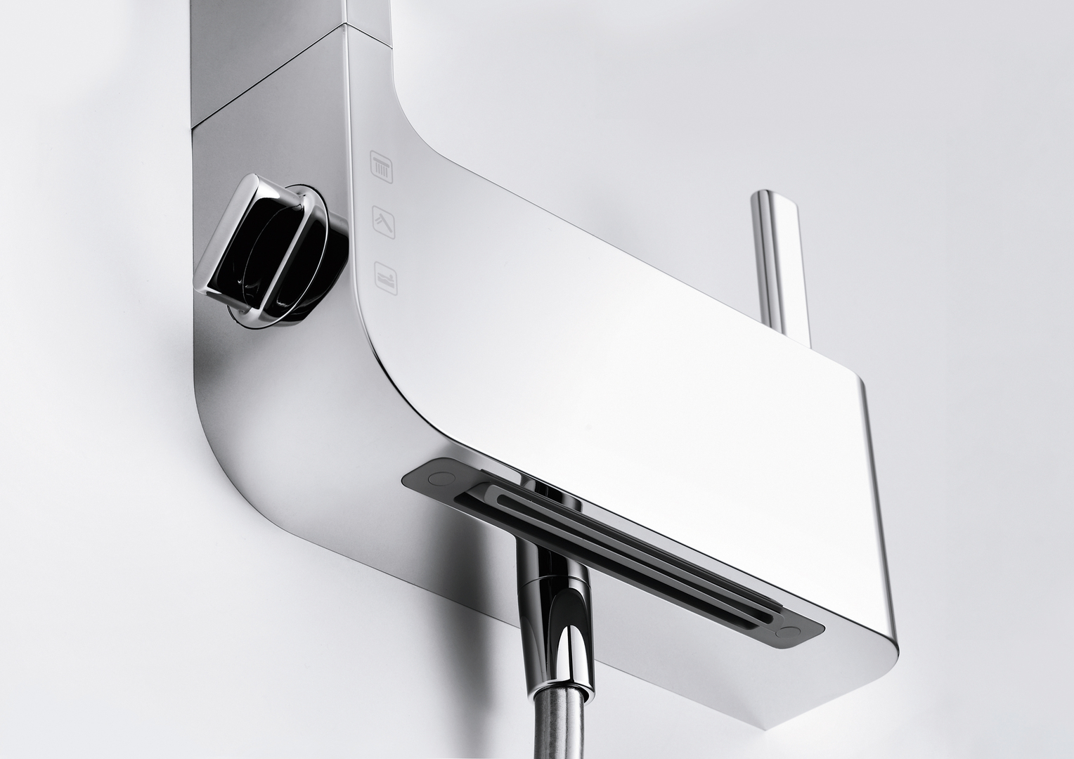 The design of Pnuma is based on a new interpretation of the connection between water and man. The space between shower head and body is meant to be filled out with a powerful water flow, giving the user a feel of complete regeneration when in the shower. The restrained and refined form of a harmonious unit of spout, fitting body and shower head, at the same time, emphasises the vitality of the water flow. The asymmetric structure with one side open also increases the application efficiency.