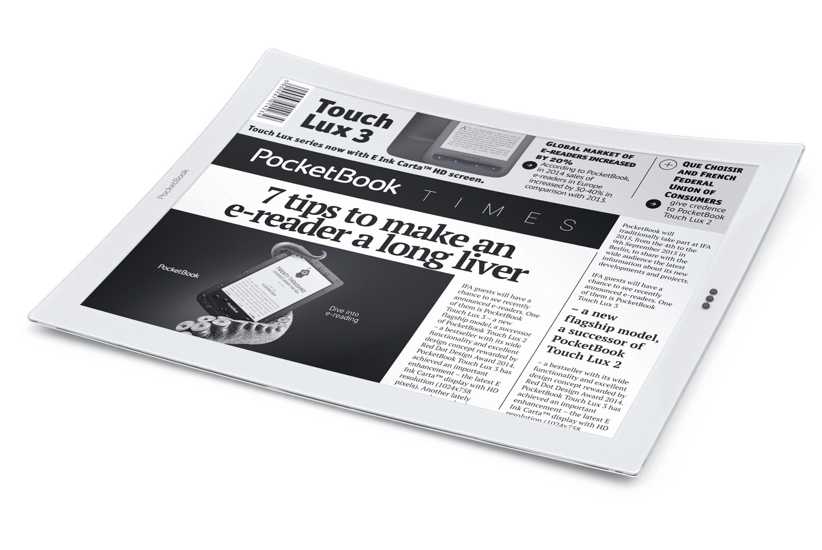 The PocketBook Reader Flex is an e-reader for indoor and outdoor use. It is equipped with a flexible 13” di-splay, with a housing thickness of merely 6.5 mm. The e-reader can be used as both a stand-alone device and a second screen for displaying information in a magnified way, for instance from a smartphone. Complex drawings, graph-ics and documents can be comfortably viewed thanks to the large display. Books and magazines may be presented in a double-page mode.