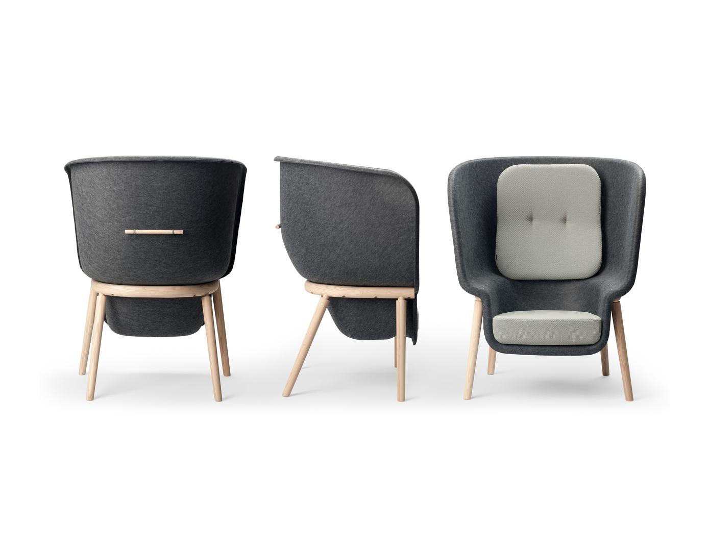 The ergonomically designed Pod chair, which is open only towards the front, allows users a feeling of privacy and to work comfortably even in the hustle and bustle of a busy environment. It is almost a little separated room within the room. The large shell of the chair is made of recycled PET felt, which has not only distinctive aesthetics but also sound-dampening properties. The chair is stackable, allowing for environmentally friendly transport and storage in large quantities.