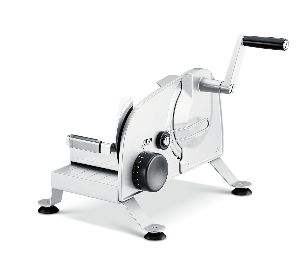 The main feature of the hand-operated food slicer made of solid metal is its functional design. Operated by a stable yet smooth-running hand crank, the podio3 can be used anywhere. A user-friendly preparation of food to be sliced with up to 20 mm slice thickness is facilitated by a guide bracket and a slide made of stainless steel for the food to be sliced. Four silicone feet prevent the device from shifting during the slicing process.