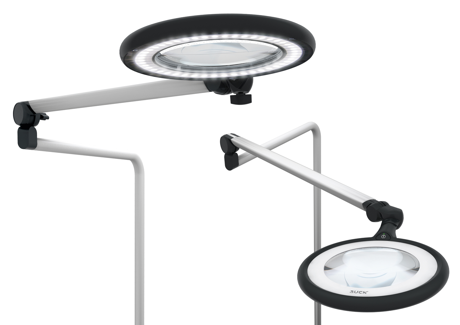 The development of the compact Podolog Circle S LED lamp, a magnifying lamp for mobile use in foot care and podiatry, is now followed by the XL magnifying lamp for use in practices. It features a simple practice-oriented design and allows pivoting and swivelling in almost any direction. In addition, it provides intensive yet energy-saving illumination and distortion-free magnification.