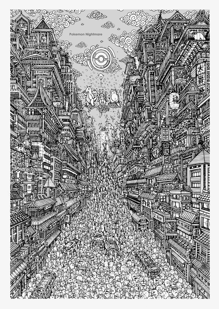 Pokemon Nightmare takes a critical look at the smartphone game Pokémon Go. The illustration is based on the idea that the players surpass themselves in the virtual world while they seem to be blind and controlled by a foreign power as soon as they return to reality. Accordingly, the poster confronts the observer with a bleak metropolitan scene, in which Pokémon symbols tower above a swarm of fantasy creatures. The abundance of filigree details triggers a claustrophobic feeling while uniform structures waken the impression of being lost in the crowd.