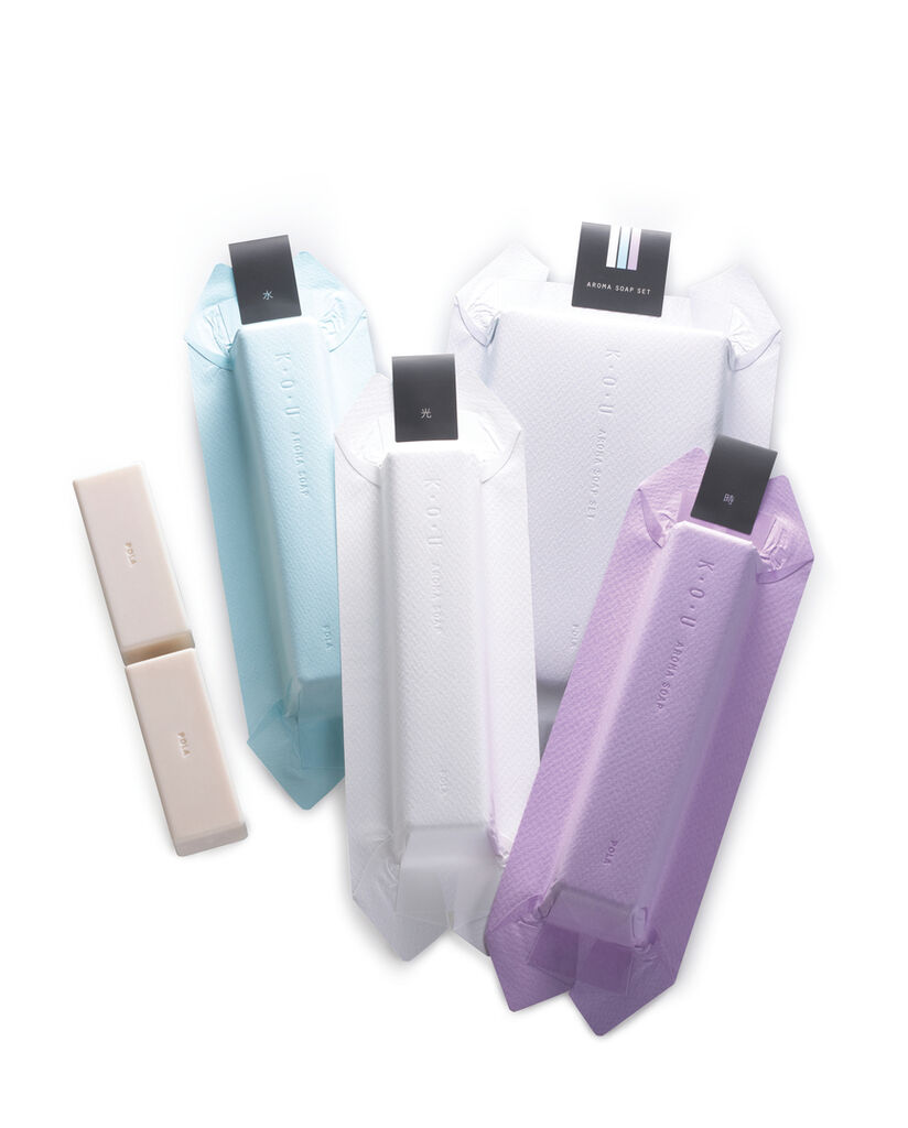 K.O.U is a soap blended by expert fragrance masters to achieve a distinctive Japanese bouquet. The packaging draws its inspiration from cultural elements such as origami, the traditional Japanese art of paper folding, in which individual flat sheets of paper are folded into an infinite selection of shapes. Each bar of soap is therefore wrapped in a single length of paper. This stellar creation of encasing perfection creates an illusion that the soap is nestled in separate vacuum-packed layers. The focus lies on the exceptional quality of the material. Special pressing technology, engineered to prevent the paper from tearing, enables this pioneering paper-box approach.