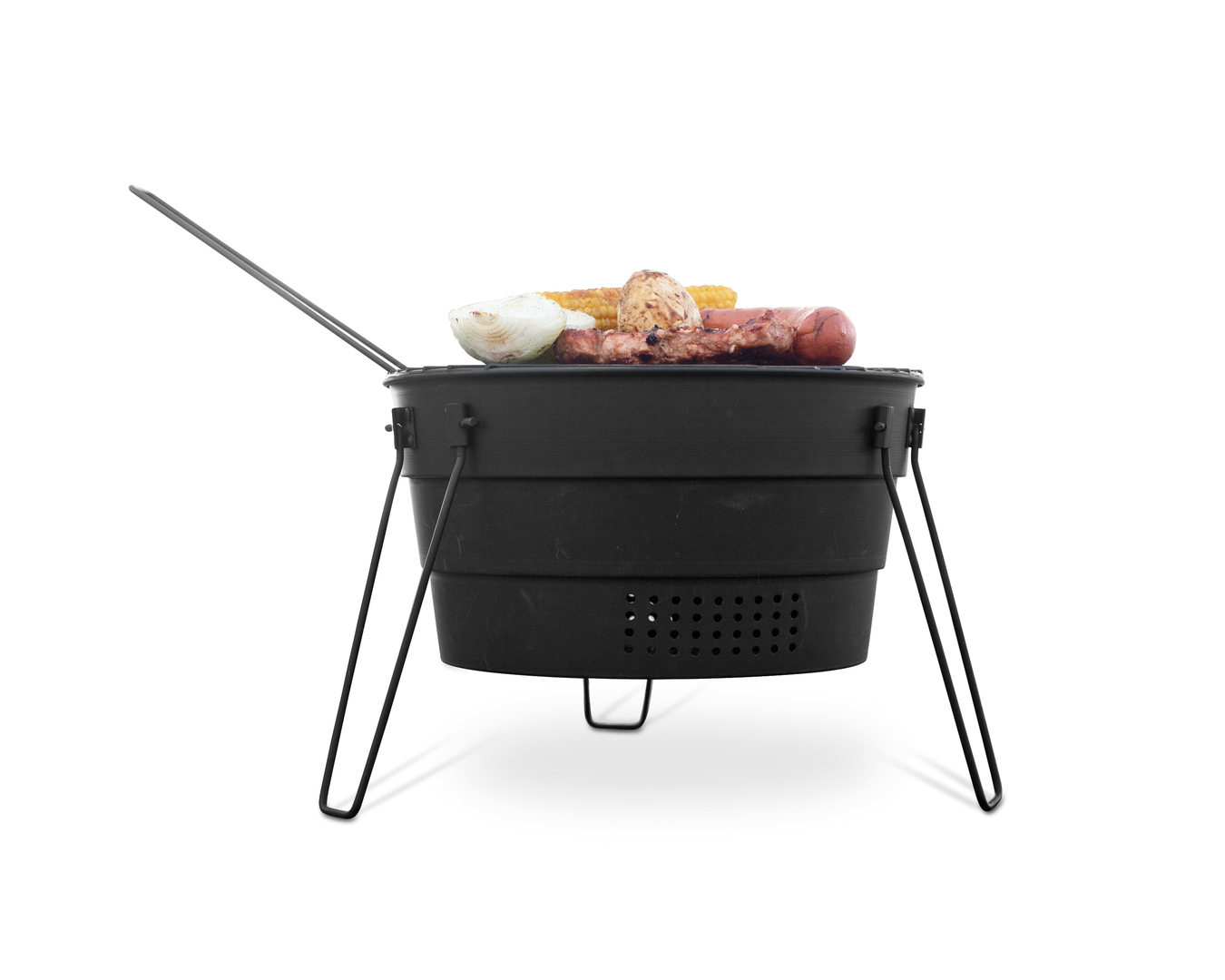 This transportable and collapsible grill was conceived as a sustainable alternative to disposable grills. It can be used with charcoal, briquettes or over an open fire. A simple, tapered form gives it a high degree of functionality and makes for low-cost production. It is stable even on an uneven surface. It comes with a tote bag and strap for easy transport.