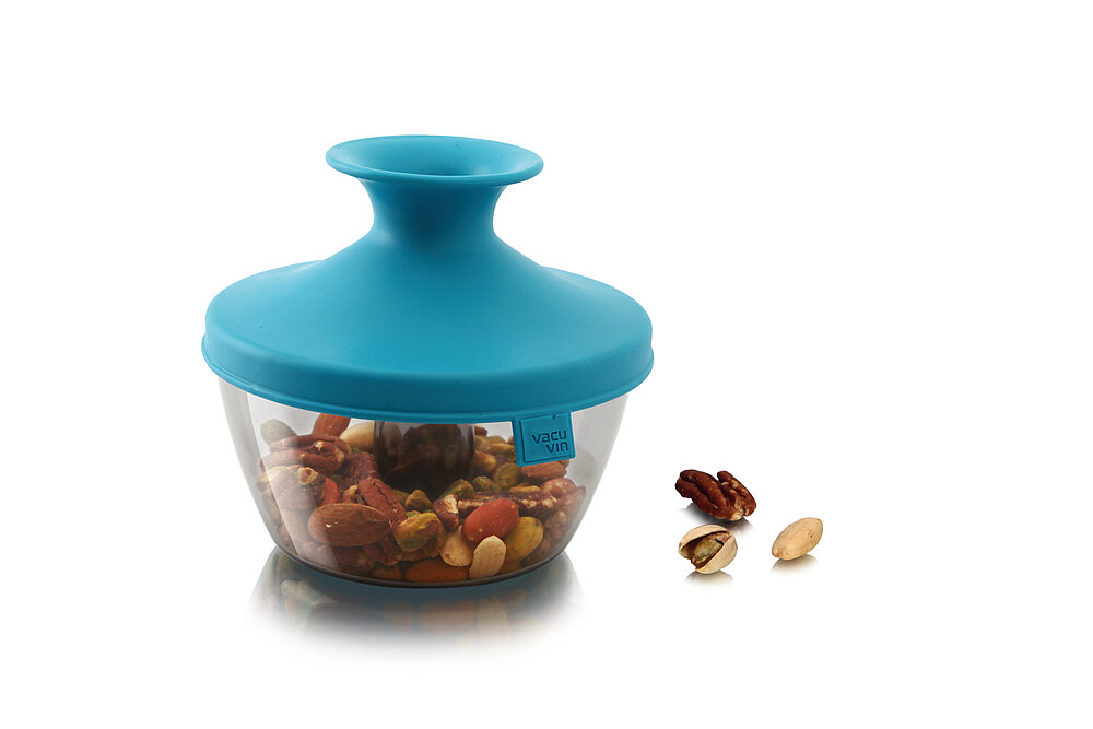 These colourful and practical snack dispensers were especially developed for the storage and dosing of nuts and sweets. Their patented Oxiloc system creates an airtight seal by pressing down the soft plastic lid with a simple movement. The air automatically escapes from the container, which has no edges, and thus the food stays fresh longer. When the lid is opened, one portion is hygienically dosed by low pressure and can be removed easily. An innovative combination of lid and container allows for high functionality. With the objective to use a minimum of material, a food-safe, BPA-free and fully recyclable plastic was chosen. The manufacturer wants to make a social contribution by employing mentally and physically disabled people. The product line is available in various sizes and in the colours pink, blue and purple.