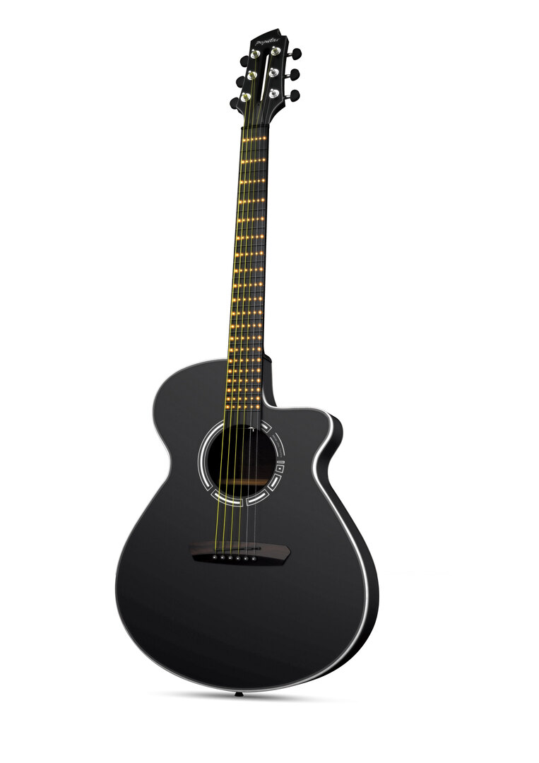 The guitar Poputar P1 surprises with a truly striking innovation: by using LEDs on the guitar neck, playing can be learned solely visually without any conventional methods.