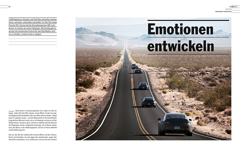 Porsche embodies sophisticated sports technology and design. These characteristics are put centre stage in the company’s 2011 annual report. Authentic storytelling guides readers into the fascinating world of the carmaker. A high level of originality together with a pure and expressive design mark the publication. The design of information graphics is inspired by the automotive world: the content is shown in form of a gearshift and the group’s key indicators in a dashboard. The typography plays on black-and-white contrasts reminiscent of the chequered flag from the racing circuit.