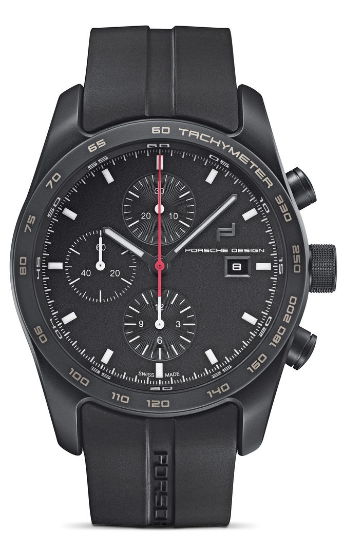 Timepiece No. 1 is the first to be developed completely in-house. Its design is based on the same principles as Professor Ferdinand Alexander Porsche’s legendary black Chronograph I. The aesthetics of the dial further reflect the purism of Porsche Design. The hands and bar indices are filled with white luminescent material so the large dial is perfectly readable at all times. The model is equipped with a mechanical ETA Valjoux 7750 chronograph movement that has a power reserve of 48 hours. The blackened sapphire crystal case back shows the inner workings of the energy-optimised Porsche Design rotor.