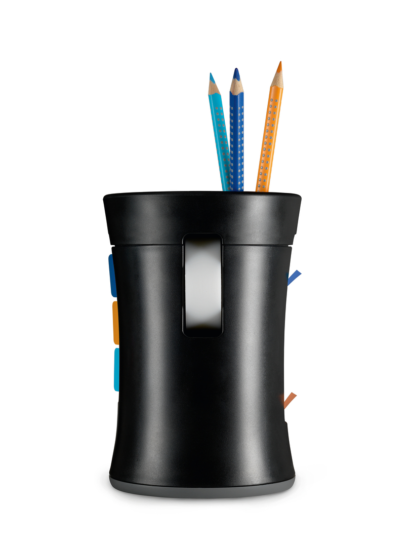 This multifunctional utility item showcases a practical solution for storing various office tools effectively. This all-in-one design saves space on small desks and does away with tedious searching for the appropriate desk item. The Post-it/Scotch COMPACT Desk Organizer CD75 provides storage for frequently used items, including Post-it Z-notes, Scotch Magic tape, Post-it Index, writing utensils, scissors, paper clips and many more. Concealed within a cylindrical module are various storage compartments. These can be accessed from the outside, with one example being the practical note and tape dispenser. This desk organiser is eco-conceived which means that not only it is partially manufactured with pre-consumer recycled material, it also follows a list of strict environmental rules to facilitate disassembly: no glue, no painted parts, limited number of pieces and materials, no plastic mix, and only snaps to attach parts. With its curvy and compact design, it can easily be taken along if the user moves desks.