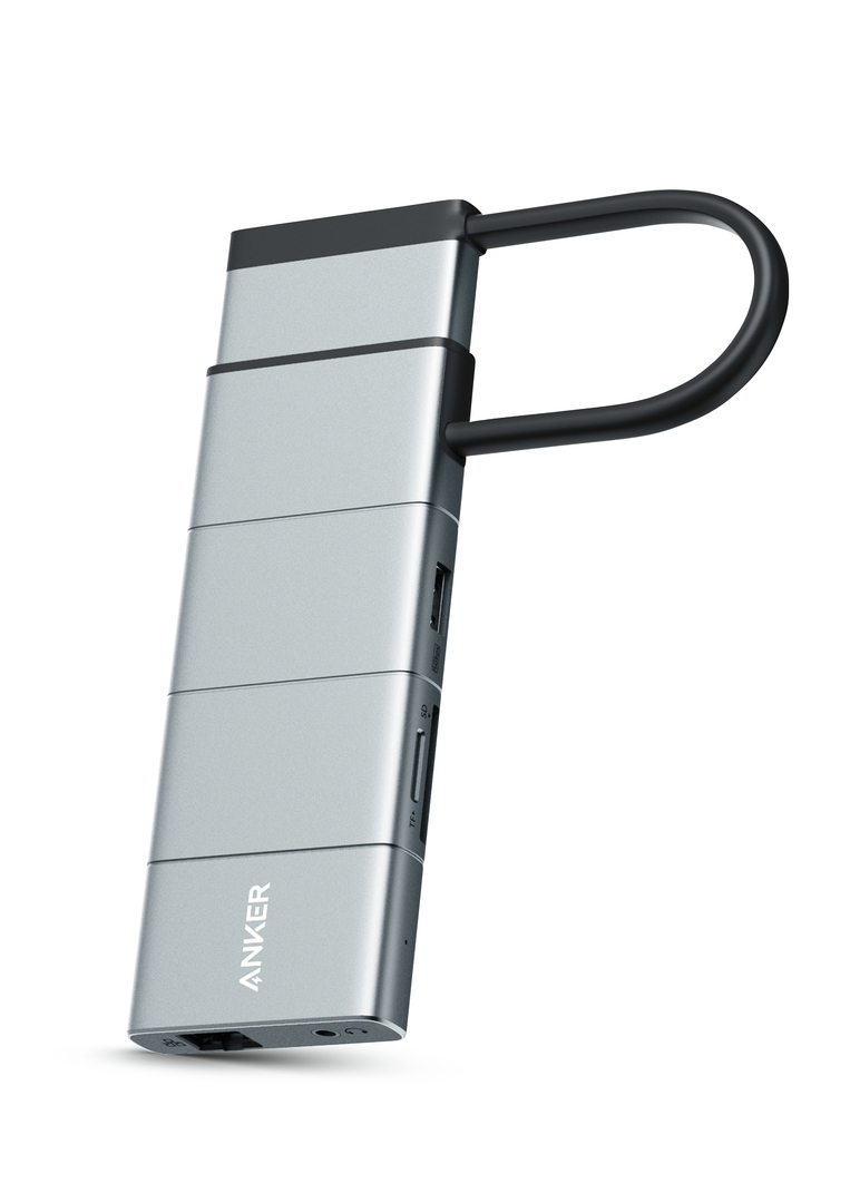 The PowerExpand 9-in-2 USB-C Media Hub has a total of nine ports and was designed specifically for the MacBook. Dividing lines on the surface split the hub into segments and show the user where a port is located. Since the connecting cable is flexible and bendable, the hub can be positioned anywhere on the desk, for instance right next to the MacBook. The USB cable with its USB-C connector is simply plugged back into the hub for convenient transport.