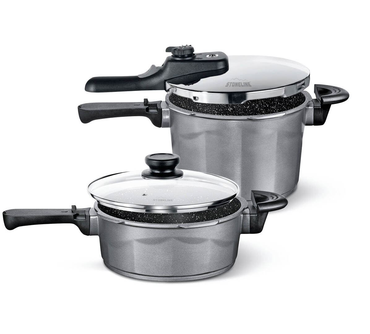 The stackable die-cast aluminium pressure cooker set features an innovative high-pressure-resistant non-stick coating with stone particles. The wall thickness of these pots is up to three times thicker compared to conventional stainless steel pressure cookers. This allows a 35 to 40 per cent higher pressure tolerance. That reduces the cooking time and energy consumption while preserving vitamins and nutrients. A steam control valve with cold-spray-fog-function reduces the risk of burns by hot steam as the hot steam escapes upwards.