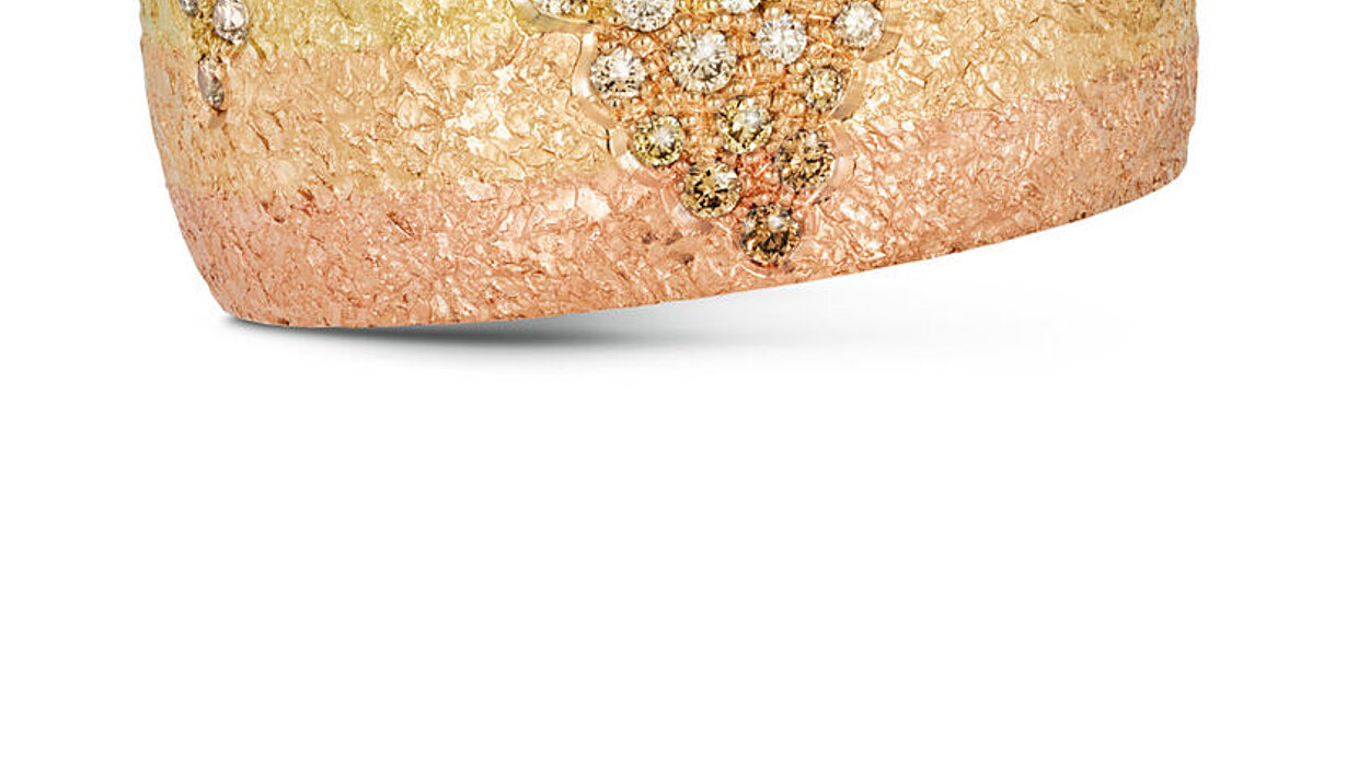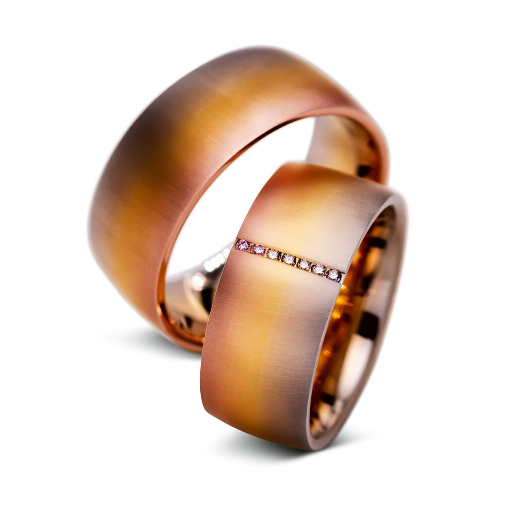 In the iridescent colour play of these wedding rings, nuances of various gold tones flow gently into one another. Light reflexion generates a silky impression on the surface. Each movement causes the light to reflect differently, imparting on the ring an organic and lively impression. Seven natural coloured diamonds, brilliantcut, colourfully matched to the particular golden shade are mounted throughout the whole width of one of both rings and provide the impression of a light band.