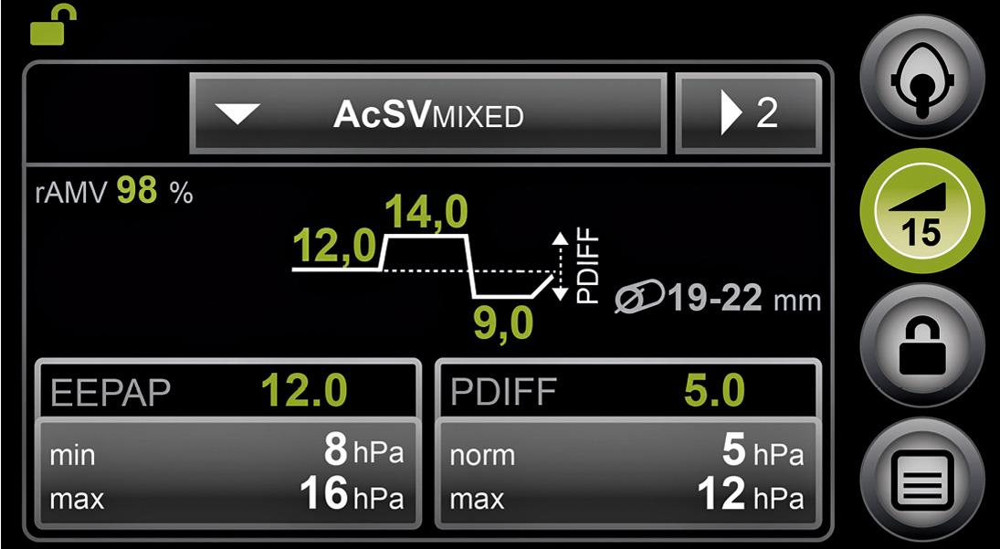prismaLINE is a device platform for the treatment of sleep-disordered breathing. Its combination of an intuitive user interface, a touchscreen and only one hard key makes it easy to operate by both patients and professional users. The dark background and minimised display of the interface, which in therapy mode only shows the time, the alarm time and possible leakage, are inconspicuously integrated into the housing. Thanks to its limited use of colour, the display provides a quick overview. For professional users, all therapy modes are supported by graphical online displays.