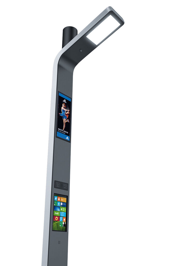 A multifunctional design concept divides Prona into three functional areas. The top section features a high-performance solar-powered LED light source, which features a photovoltaic system on top of the street light. In the middle section, a display shows multimedia information and advertising. The interactive screen in the lower part of the lamp provides real time information on four different topics: social community networks, business networks, points of interest and industrial areas.