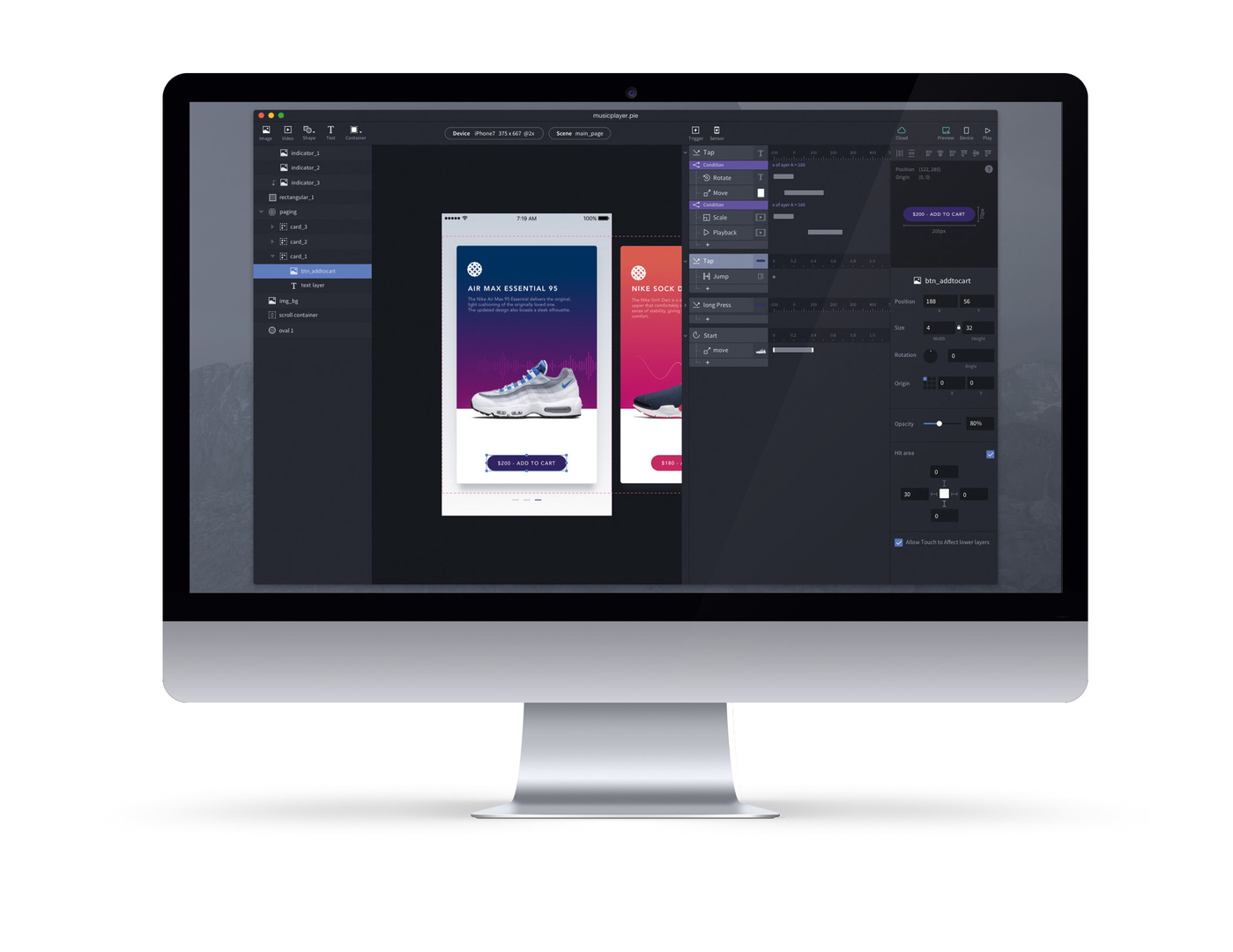 ProtoPie is a code-free interaction prototyping tool for designers of digital products. Its intuitive user interface offers an uncluttered and iterative work process for shaping interactive design ideas and the option to share deliverables with collaborators. After prototyping, the software generates a programming reference document for engineers, consisting of parameters and values for dynamics, movements and interactions. Moreover, it can utilise smartphone sensors, making it possible to transmit and receive signals among devices and to design a complex system across devices, such as IoT.