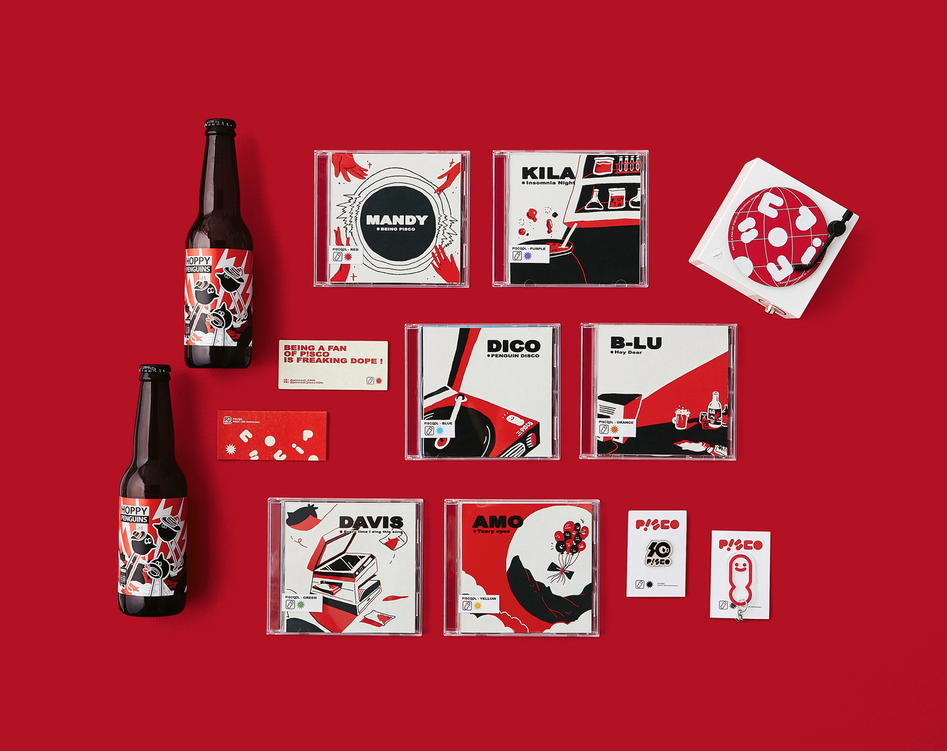 This work promotes a special event planned for the tenth anniversary of the band P!SCO. The brand design focuses on conveying a carefree celebration mood. The signal colours red, black and white mark the appearance of the advertising material, which ranges from CD covers and posters to beer bottle sleeves. Simplified symbolic characters are introduced to embody six signature songs of the band. While these eye-catching figures target the fan community through their cheerful style, bold font with integrated symbols contributes to creating an energetic atmosphere.