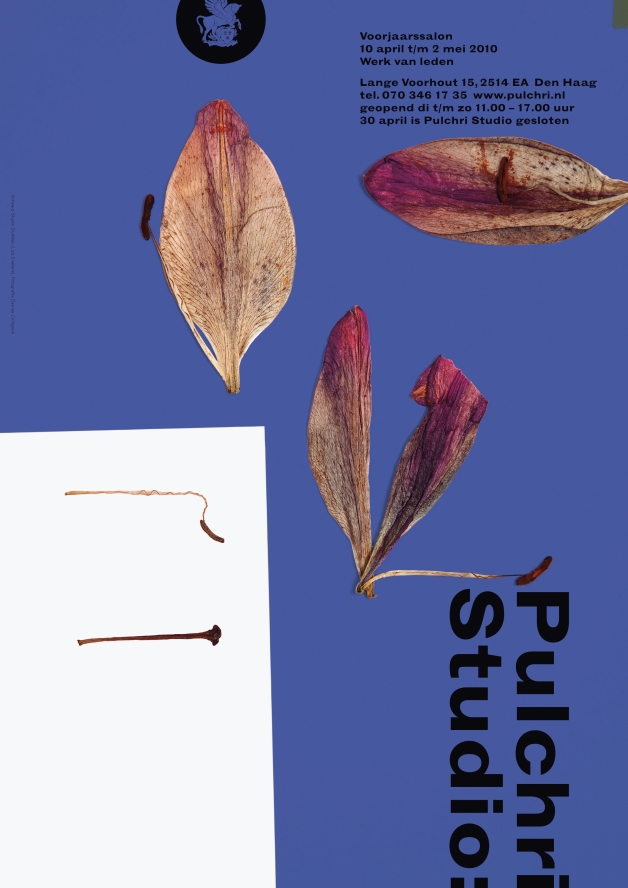 This poster promotes the annual spring exhibition (Voorjaarssalon) as well as the over 100 years old artist society Pulchri Studio as an active organisation and exhibition space with room for both established artists and young talents. The arrangement of natural elements in the poster design reflects the way visual artists structure and manipulate elements from the world around them in their work. The tinge of colour accenting the lily petals references new life arising in spring.