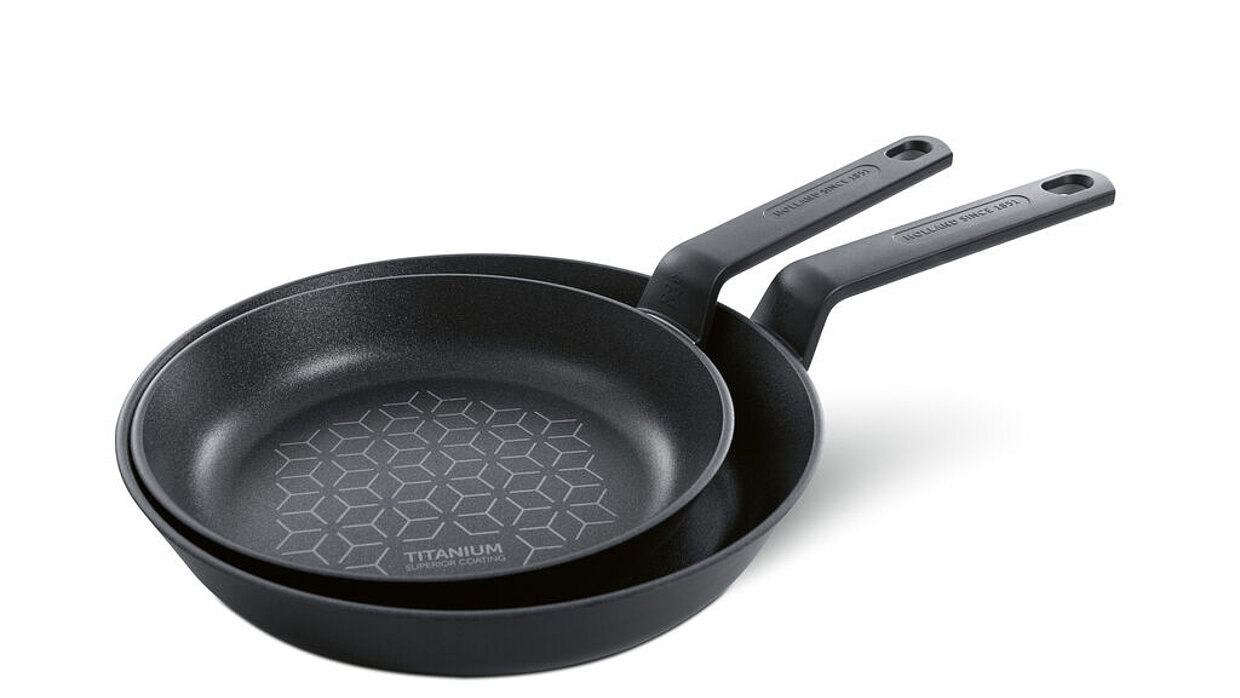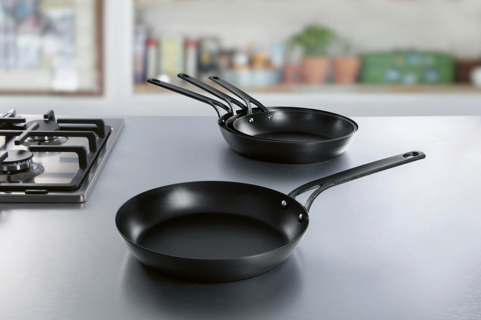 These frying pans owe their puristic appearance to a consistent design, showcasing the material properties of carbon steel.