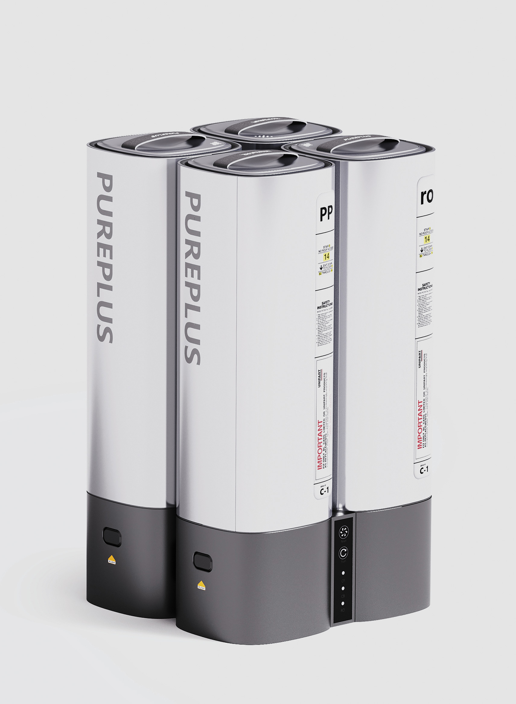 The PUREPLUS home water purifier features a sleek, streamlined design that integrates seamlessly into modern interiors, saving space while enhancing aesthetics. Its innovative modular structure provides efficient, cost-effective production and easy maintenance, hence extending product lifespan and reducing e-waste. A front display offers real-time status updates, while a replaceable rear interface expands service options to meet diverse user needs.