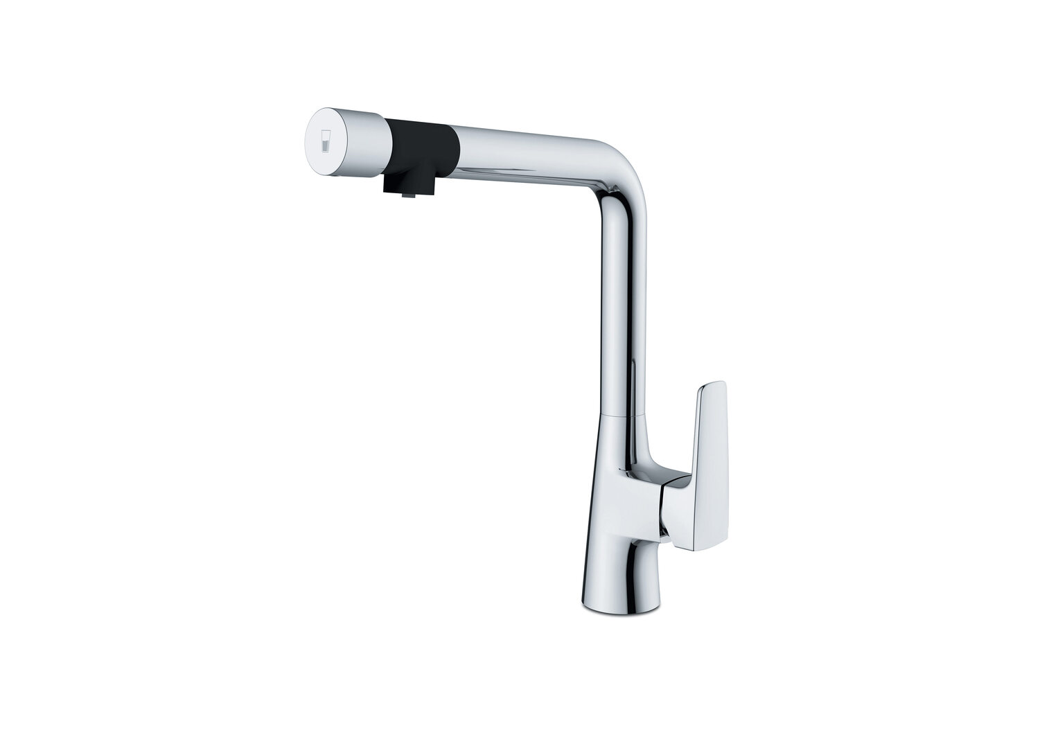 Purigo is a 2-in-1 kitchen tap which dispenses filtered drinking water as well as normal tap water. This combination of both functions in one tap saves the user costs and space since neither a second tap nor a further connection is needed. The button for the drinking water function is easily reached, situated at the end of the tap head; for filtered water, a separate output is used for reasons of hygiene.