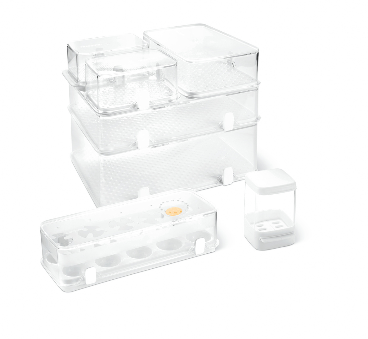 The Purity containers for the refrigerator allow the space-saving storage of food and are manufactured from polypropylene, certified even for medical and pharmaceutical use. Their flaps open and close easily. The containers come with a double-sided bottom with protrusions. They prevent adhesion and moisture absorption while a raised rim prevents leakage. The egg container features a date indicator and has a flexible adapter which makes sure eggs of all sizes can be carried safely.