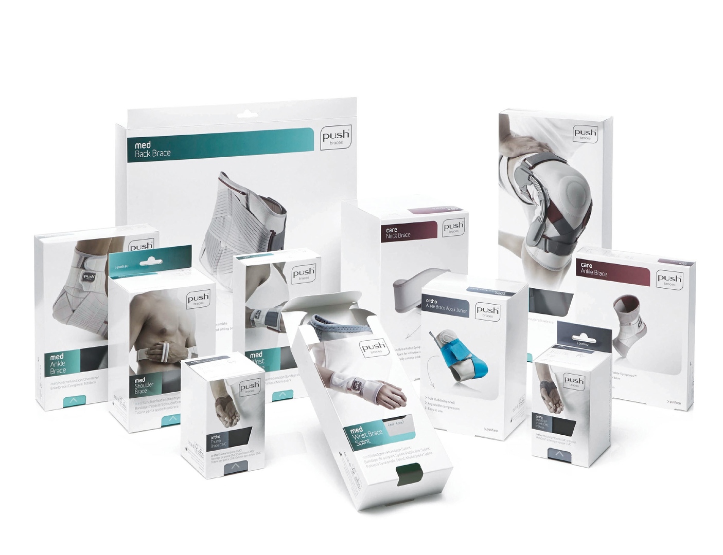 Push Braces stand for quality, ease of use and comfortable support. The new packaging line is based on the brand’s core principle “Push for freedom and get your active life back!” The users will experience this as soon as they start to open the packaging. The braces are pushed out of their enclosure in an innovative way. The semi-transparent windows and intuitive colour coding makes product selection easier for users, therefore enhancing the quality of the product line. The dynamic and appealing visual language of the product communicates the liberating benefits for the user.