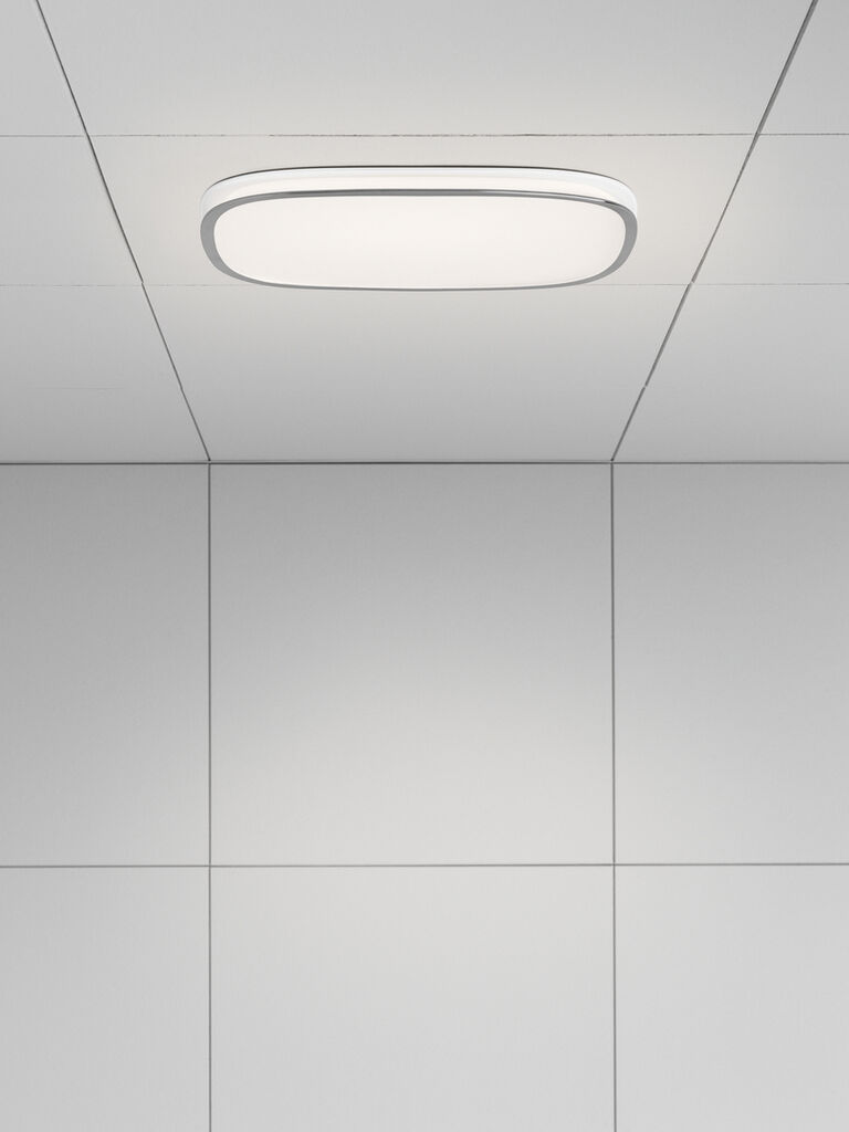 Quad is a very slender LED ceiling luminaire with an elegant chrome frame. The acrylic glass cover’s microprism structure deflects light and hides the LED circuit board with the cooling system. As the luminaire is protruding, some of the light is projected onto the ceiling, thus creating a discreet corona. This refined design detail enables a downlight to become an uplight at the same time. Quad is available in two sizes.