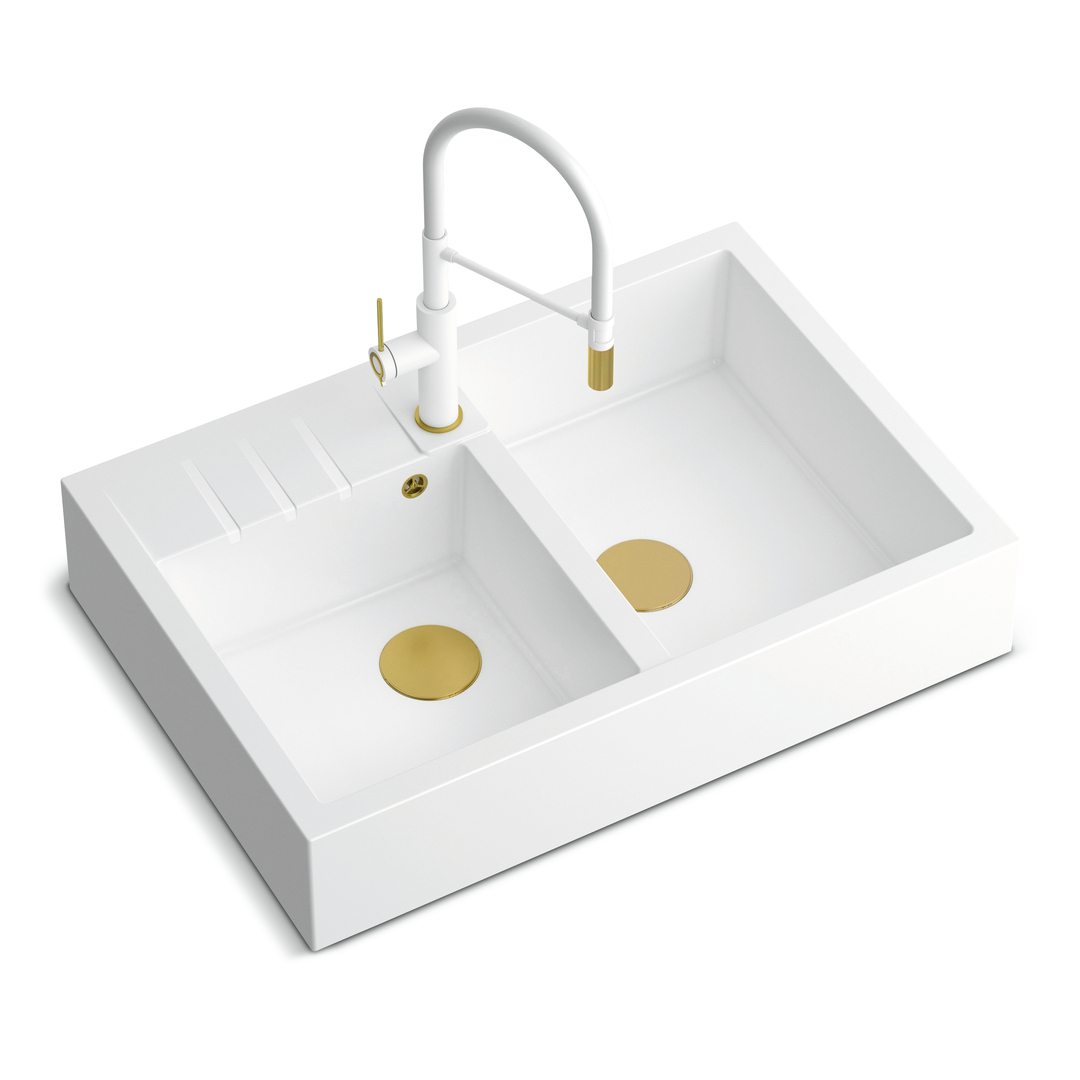 The QUADRON BILL 120 kitchen sink consists of two large bowls that offer plenty of space to work. A specially designed drainboard permits the placement of kitchen utensils or enables food to drain. The appearance is characterised by a clear design language with a rustic look, making it suitable for use both in country-style kitchens and in kitchens with modern interiors. Combination with the striking GEMMA faucet gives rise to an integrated product. Special accents are set by golden elements.