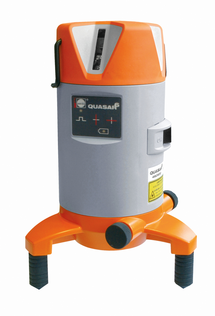 The Quasar 6 cross line laser displays the typical design language and colour scheme of the manufacturer. Orange-coloured soft components protect the sensitive technology found within the light grey housing. Viewed from above, the laser outlet openings are faceted to symbolise the basic function of the device. The adjustable tripod feet facilitate an optimal view of the plumb point projected downwards and give the laser stable footing.