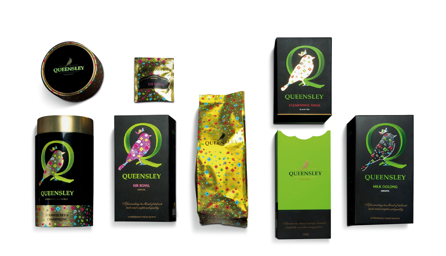 Queensley is a Russian elite tea brand for consumers who prefer delicacy and uniqueness. The objective for the development of the name and the package design for this brand was to turn tea into a kind of artwork, which appeals especially to the hearts of elegant women. The logo features a crowned singing bird, sitting inside the majuscule “Q”, which is stylised as a ring. For each tea flavour, its colourful feathering boasts a different basic colour, from silver, pink and black to white or gold. All colour combinations form a striking contrast to the black packaging.