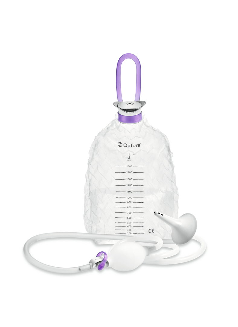 The design of the Qufora IrriSedo Flow aims to create an easy-to-operate, flexible solution for bowel irrigation. As a result, the system supports different usage patterns and environments: for instance, the water container has dual positioning options, either standing or hanging on the wall. Ventilation ensures that the container is positioned stably, even when it contains only a small quantity of water. The insertion cone has five additional water outlets for effective multidirectional water flow. All of the important contact points in the system are discreetly labelled.