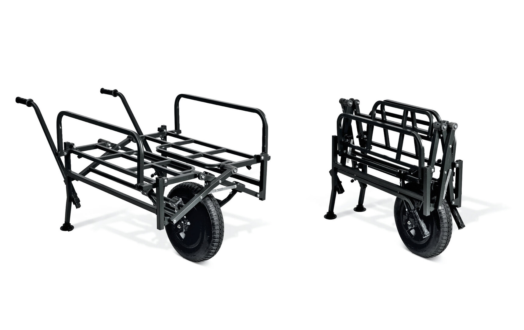 With a simple folding mechanism and without the need to detach the wheels, this fishing barrow fulfils a fisherman’s need for a quick folding luggage trolley. This practical benefit is realised by a multi-link structure in which all connections mutually relieve strain. The fishing barrow thus achieves a small pack size increasing the ease of use, and is also fast to set up and dismantle. In addition, the steel and aluminium materials lend the trolley stability as well as making it light-weight.