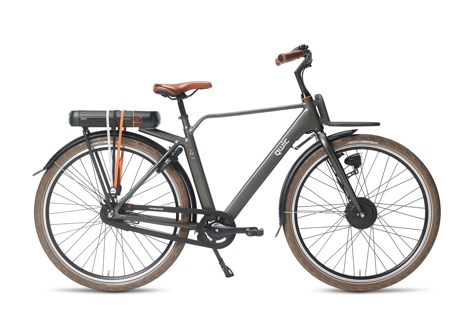 The QWIC A2.1 electric bicycle showcases a clear design and, thanks to its automatic gear, allows riding really fast. The hand-built frame features smooth welding and integrates all cable guides. The urban look and feel come from the brown balloon tires and the robust front carrier. The efficient electric drive train with eight power levels, a powerful 250 W Ultra Low Friction+ motor and the Silent Drive system provide a high-class performance.