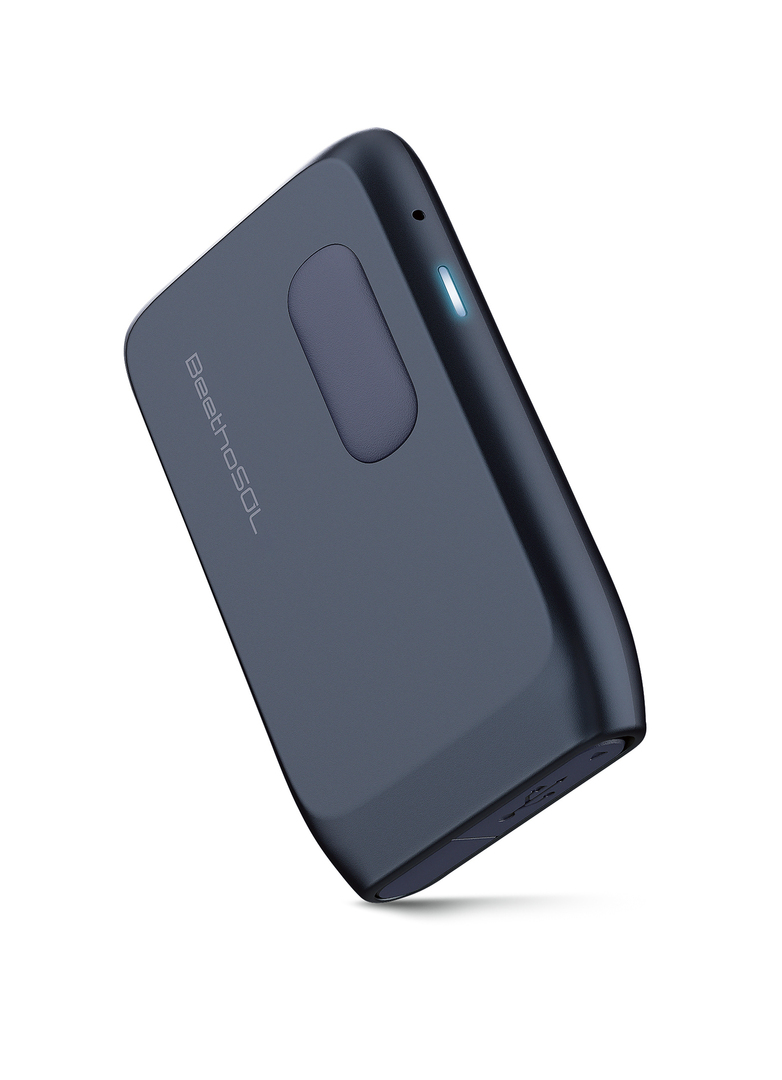 The R-100 sound amplifier is designed for people with hearing impairment. It transmits audio signals from a source connected via Bluetooth, for instance from headsets or speakers, so that the user can listen to incoming sound without irritating ambient noise. The compact device is attached to clothing with a clip so that the sound is emitted in close proximity to the user. The advantages of the device play out in particular in the context of conferences and lectures.