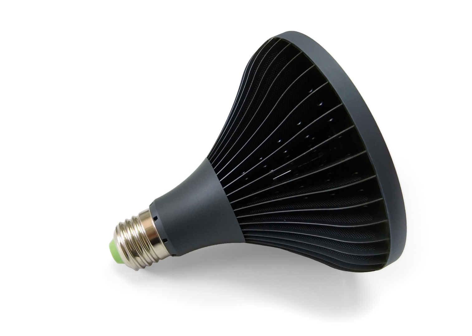 The R5-PAR38-WHT combines the best characteristics of an LED lighting source into one unit, as the new heat sink technology provides improved heat dissipation. This both maximises the performance of the LED light source and extends the lifetime of the LED lamp, while, at the same time, saving energy. The heat sink consists of aluminium fin plates, which allows for 35 per cent less weight than standard PAR38 lamps. Due to the low heat development, the lamp can be touched without danger at any time. The design of the LED lamp is inspired by the shape of a blooming flower and features a low profile as well as a luxurious grey colour.