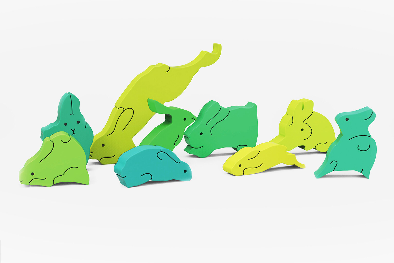 Rabbit is a puzzle toy for children. Each puzzle module resembles a different rabbit, and each rabbit serves a different purpose in the story. Using the rich body language of rabbits, the puzzle is given a story of freedom and play to satisfy every child’s unrestrained imagination. When the rabbit modules are combined, the final image is revealed to be a larger rabbit.