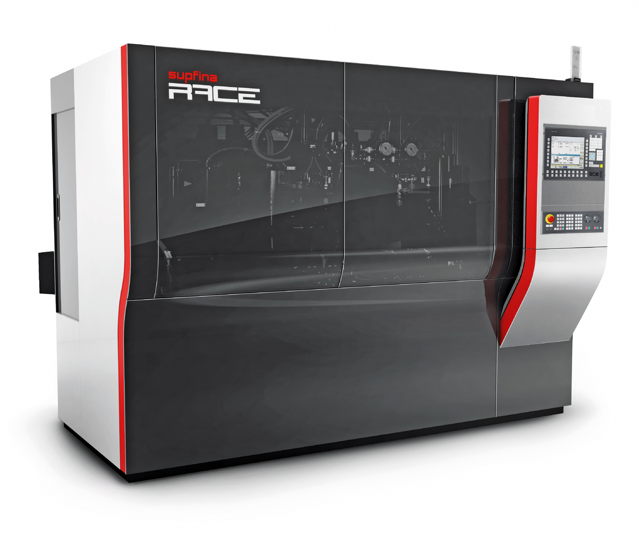 The Supfina Race 717 is designed for the superfinishing of roller-bearing races in the micrometer range. Featuring an automated sliding door as well as a flush real-glass front, which curves outward to the user, the machine mirrors the extremely precise machining process under clean room conditions. The operating panel picks up the wave design of the whole machine and is thus recognisable as the heart of the man-machine interface.
