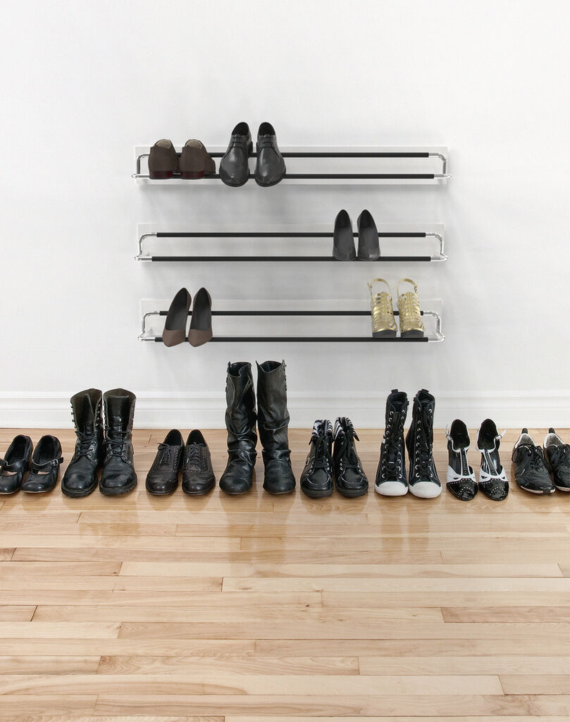 Rada is a shoe rack of minimalist design in chromed steel and coated with a special paint. Its unusual shape makes it possible to store shoes in two different ways, rendering it suitable for both ladies shoes with high heels as well as trainers and boots. The mounting plate with concealed connectors also helps to protect the wall from dirt. Rada is available in two sizes: 60 or 100 cm in length.