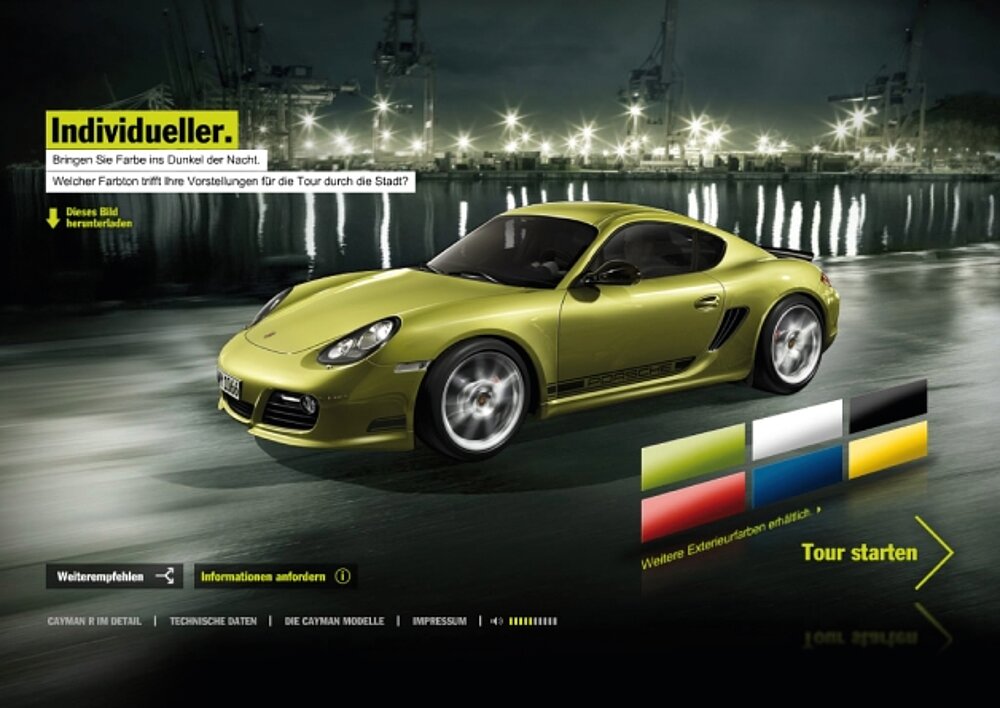 The user experiences the Porsche Cayman R during a virtual test drive through the night. Submerged in a nightly city, a mysterious looking car awaits the user, who can pick a colour and determine the route via an interactive map. Dynamic video sequences convey the feeling of fast movement and lead from one spot the other. The virtual trip is acompanied by impressive motor noise, blocks of houses are being passed and lights are reflecting on the wet asphalt.