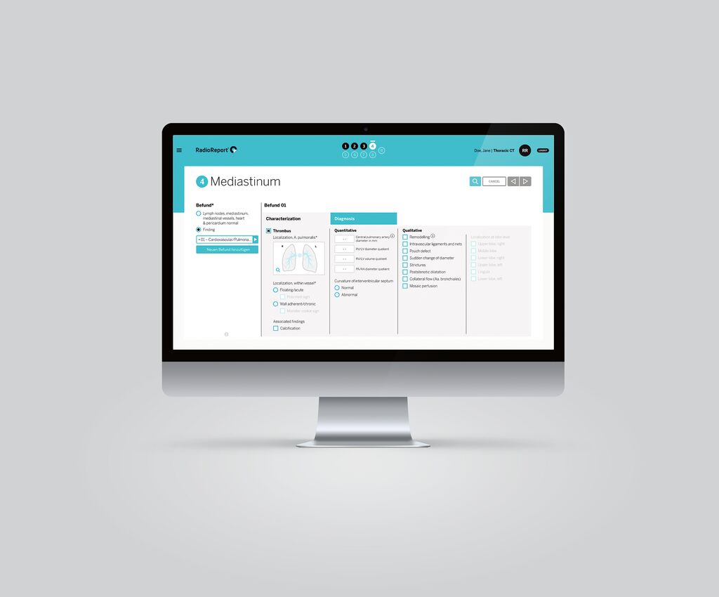 RadioReport is software that helps radiologists digitise their reports. The UX/UI design was developed in close cooperation with the target group to ensure that the needs of actual users were taken into account. Accordingly, the user interface offers intuitively arranged control elements that ensure clarity and user-friendliness. In particular, colours, fonts as well as the boldness and size of the controls provide good readability, orientation and a positive user experience.