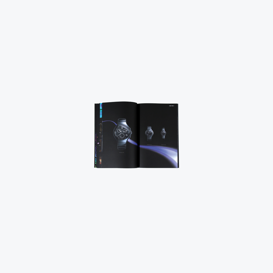 The matte black cover of this product catalogue for a watch manufacturer features glossy black silhouettes of different watches. The inside of the catalogue is also designed in black – on the dark pages, intense colour highlights, photographs and coloured typography create strong and vibrant contrasts. The catalogue introduces different watch families, with each presentation following a unique image concept and its original storyboard. The design of the catalogue targets customers from all over the world – the biggest sales markets of this watch manufacturer being China, India, the Middle East, Europe and North America – which is why it has been published in nine different languages.