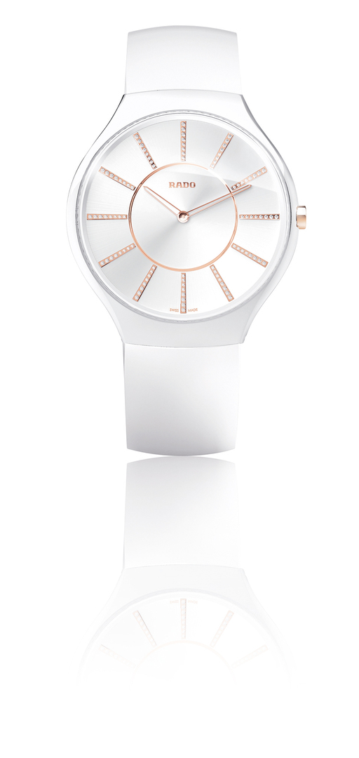 The Rado True Thinline, made from high-tech ceramics, is one of the thinnest wristwatches worldwide. Since the material was pioneered by Rado in 1986, high-tech ceramics has become the company trademark. This model fits around the wearer’s wrist like a second skin. With a casing depth of as little as 4.9 mm, a movement height of just 1 mm, and a weight of a mere 35 grams, only the watch’s beauty and precision remind the wearer of the fact that it is there.