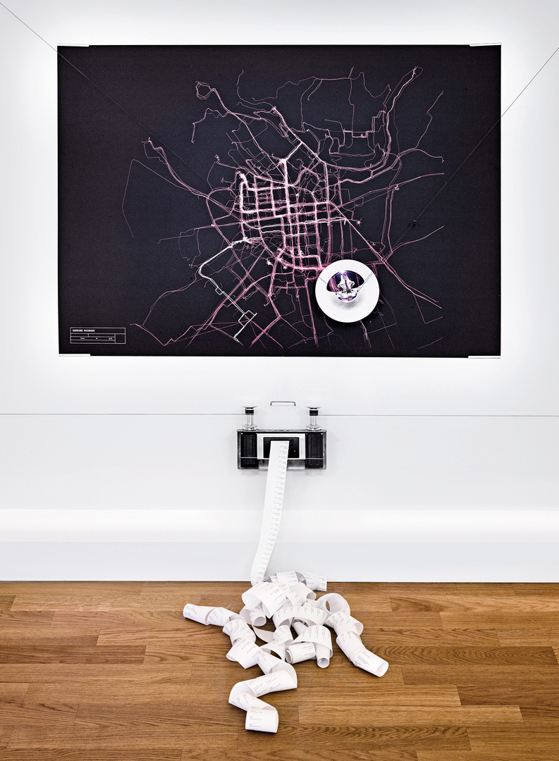 This installation was part of a campaign initiated by activists as a response to the fact that the town of Wiesbaden, according to an assessment, was ranked as the least bike-friendly city in Germany. Therefore, the aim was to open up new possibilities together with cyclists, based on the individual routes they take, to create a fictitious city map. A drawing machine in the Wiesbaden state museum recorded these cycling paths on a daily basis and thus produced a work of art every day, showing where cycling lanes were most needed.