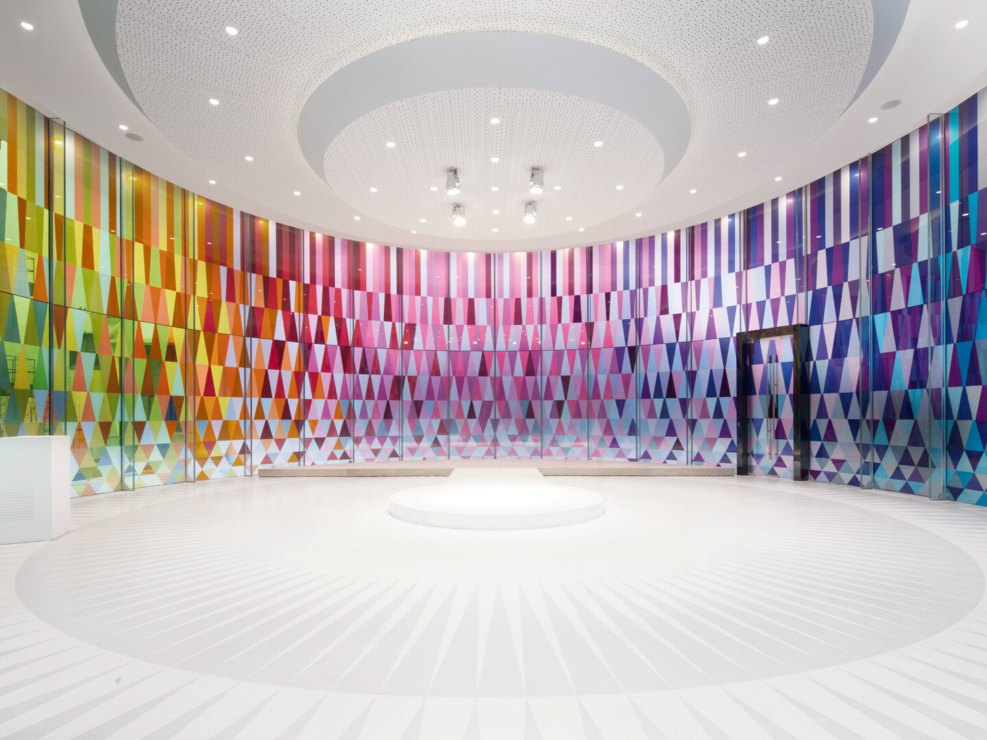 The Rainbow Chapel in the Shanghai Museum of Glass Park is a multifunctional event space enclosed within a kaleidoscope of colour nuances of inspiring appeal. The objective to create a friendly, communication-inducing atmosphere resulted in a space with a circular form and magical glass reflections. The surrounding environment is also dedicated exclusively to the diversity of glass. The Rainbow Chapel is thus a heartfelt addition to the city of Shanghai. It is both sleek and highly artistic at the same time, while still serving as a sacred space for people to celebrate momentous occasions.