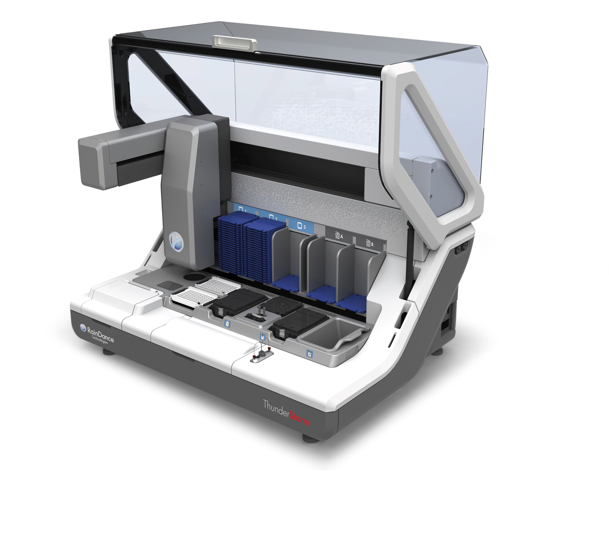 The fully automated RainDance ThunderStorm sequencing system can process up to 96 samples simultaneously. A major focus of the design was on creating an open architecture that enables fast and efficient loading and unloading of samples. Since it is a relatively large unit, the colour palette was chosen to make the system appear smaller.