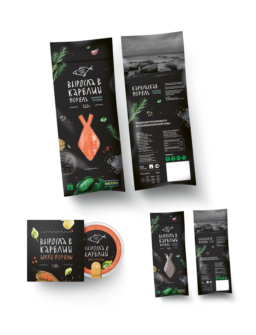 This branding and packaging for a fish farm in Karelia, Russia, visualises the high quality of the purely organic fish product, a delicacy as it is just salted and smoked trout. Since the product used to be marketed only locally, a comprehensive brand platform was created along with the claim “Raised in Karelia” to highlight its quality. The result of a solid design approach, an easily identifiable packaging was created that yields a high degree of trust among consumers.