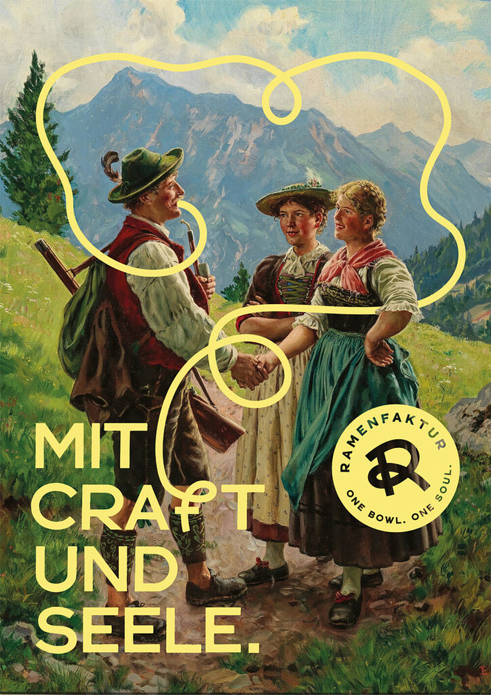 Juxtaposing old Bavarian oil paintings with humorous and brightly coloured headlines and illustrations, these posters combine contrasting worlds in a playful and entertaining manner.