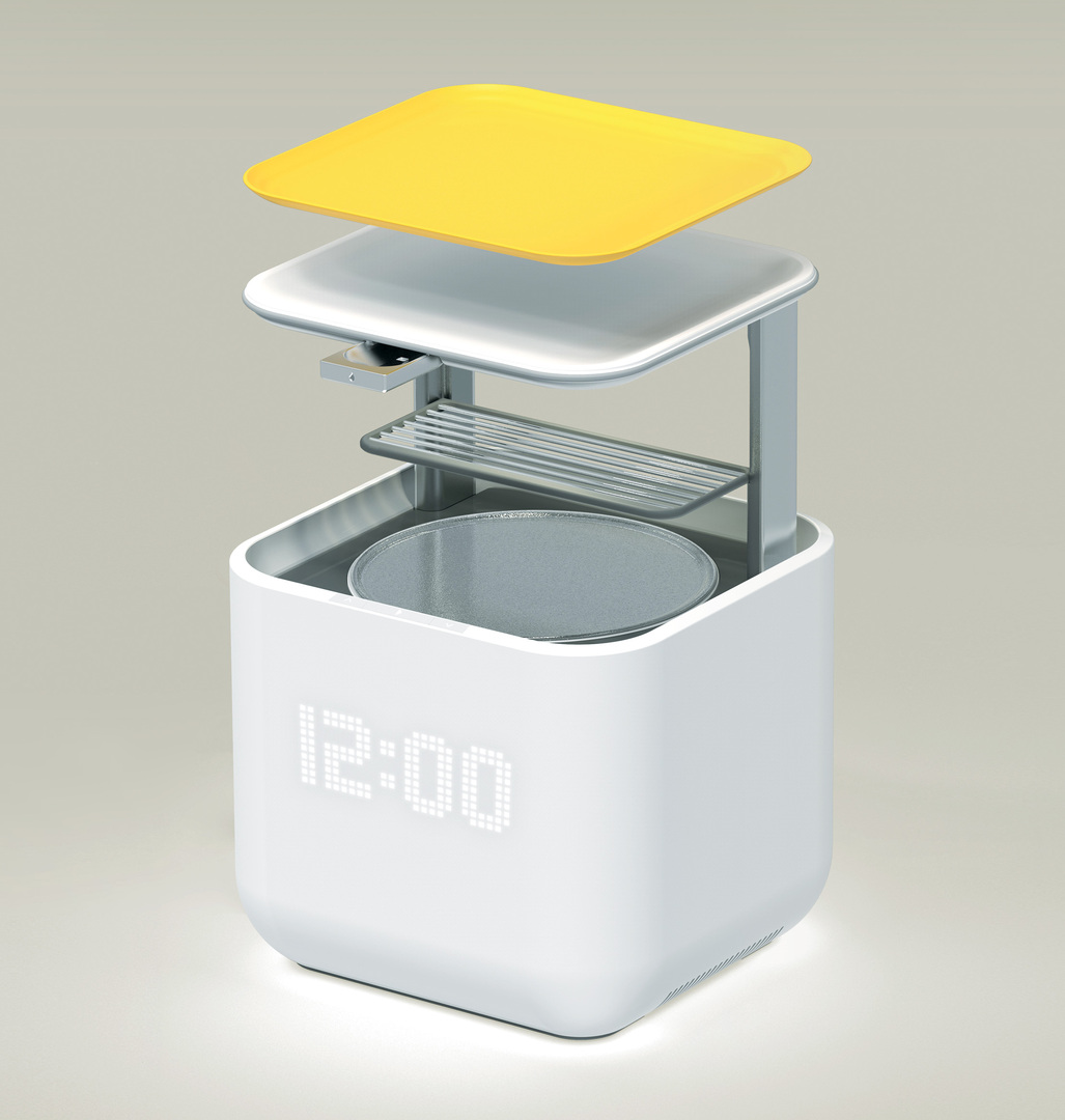 Electromagnetic waves occurs primarily on the front and right when using a microwave oven. Because the food tray is lowered into the oven, the design intuitively distances the user from the electromagnetic waves. After cooking, the tray automatically pops up so that the food can be easily retrieved. In addition, the integrated electronic scale and detachable coloured tray make cooking more convenient, while the large LED display on the front provides excellent visibility when checking the cooking time or the electronic scale.