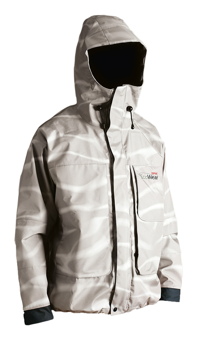 This fishing jacket features a design-protected asymmetric pattern that mimics underwater light reflections, thus acting as aquatic camouflage. It is manufactured in an ecologically sustainable process that significantly reduces its environmental footprint and dependence on petroleum. The jacket can be worn as either a short wading jacket or a mid-length jacket. It features comfortable, watertight cuffs and a fully adjustable hood with an extra-large visor.