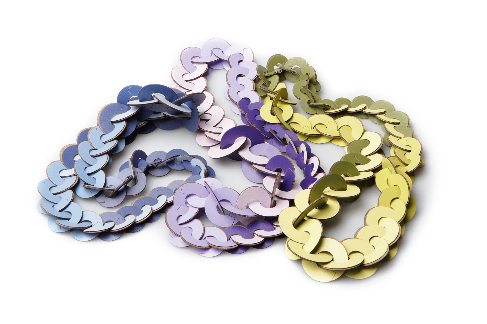 The rattlechain necklace is based on one single element: a circular ring. During the manufacturing process, two elements at a time are pinned together with the coloured sides facing outwards, and the wood-like surface of the inside is also visible in places. The material used, Resopal, is made of 65 per cent paper; it is hard, scratch-resistant and ultra-light at the same time. The chain attains its liveliness from the interplay of the changing colours.